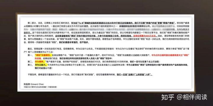 “得到”公司的很多數據都在云端,所以需要一個“云”供應商,每年大概有幾千萬的支出。但他們現在用的是阿里云,所以當華為云找上門來的時候,他們已經告訴對方沒有合作的機會了。然而,這位叫陳盈霖的員工卻沒有放棄羅振宇這個大客戶,而是真誠地發來一封郵件。