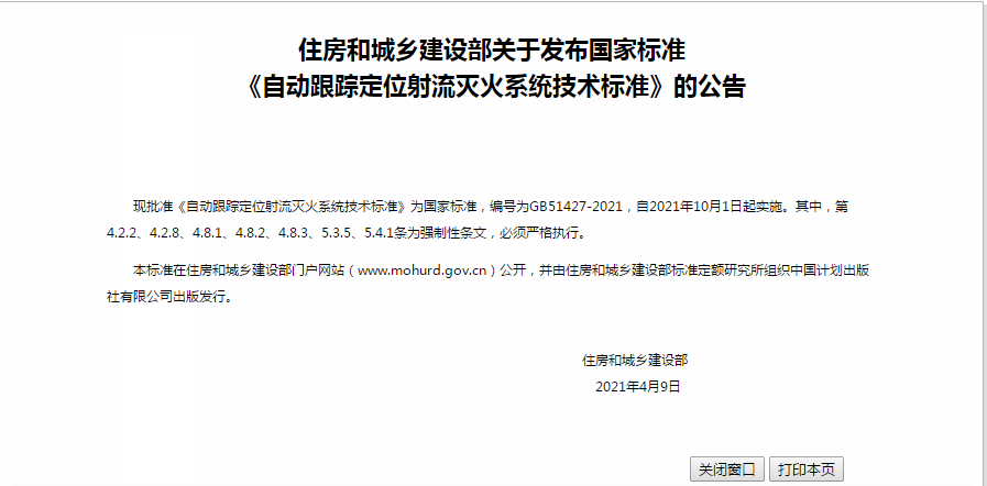 新標準《自動跟蹤定位射流滅火系統技術標準》由中華人名共和國住房和城鄉建設部頒布,2021年4月9日發通知,自2021年10月1日起正式實施。編號為GB51427-2021。