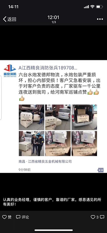 上7點(diǎn)前將水炮送到客戶手里。客戶感到震驚,豎起大拇指,說:辛苦了,兄弟。為你們點(diǎn)贊,為你們公司點(diǎn)贊。“