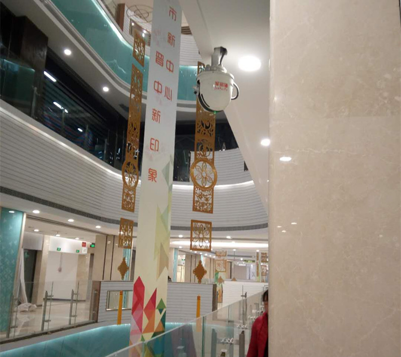 廣西南寧江南萬達廣場,商場中庭安裝ZDMS0.6/5S-JXP大空間自動消防水炮,使用水炮22臺,中庭平均面積在870平方米左右,安裝高度在15米左右,管道設計在吊頂上面,進行隱藏式的安裝,滿足每個中庭的任意地方都有兩臺水炮同時噴水滅火目的。