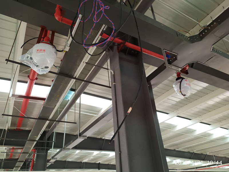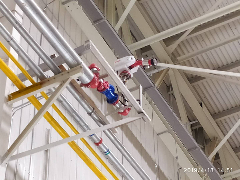 長沙福田汽車(普羅科環境設備科技有限公司)項目,長方形結構,48*113米,總面積5424平方米,軍巡鋪消防水炮廠家設計使用ZDMS0.9/20S-JXP水炮8臺,安裝高度在9.8米,分布在兩個車間,每個車間安裝4臺,管道設計在廠房兩側,實現車間內每個地方均有兩臺水炮同時噴水滅火目的。