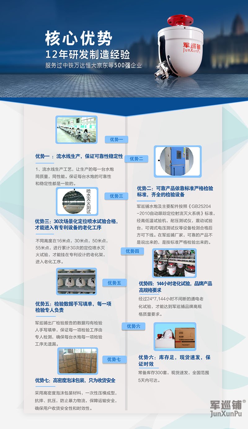 軍巡鋪大空間自動消防水炮廠家專業生產智能消防水炮,固定式消防水炮及相關產品,提供設計方案、免費上門協助驗收、價格合理。產品均有國家權威機構3C認證證書,身份識別標志等相關資料。如需對產品型號、參數、價格等想進一步了解,請致電咨詢。
