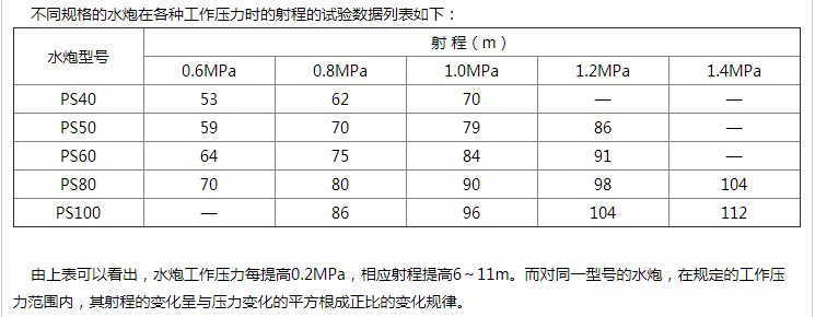 PS是手動炮,在不同的壓力下,水炮的射程不同,但是射程和壓力成正比關系,隨著壓力增加,射程也跟著增大。但是并不是絕對的,隨著壓力增加,流速增大,但是總流量沒有變化時,水的狀態會發生改變,導致水柱不成形,射程反而會近。